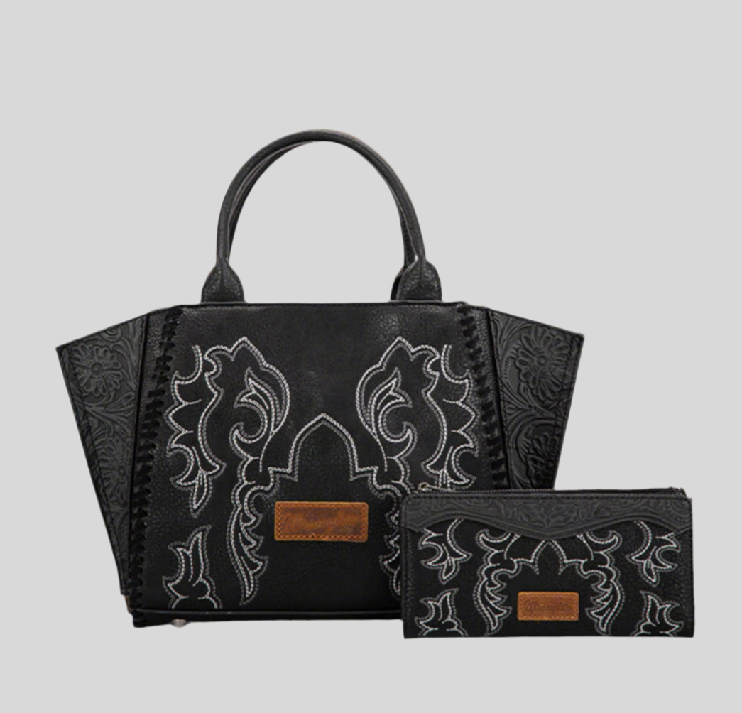 WRANGLER EMBROIDERED BOOT SCROLL TOTE BAG AND BIFOLD WALLET SET