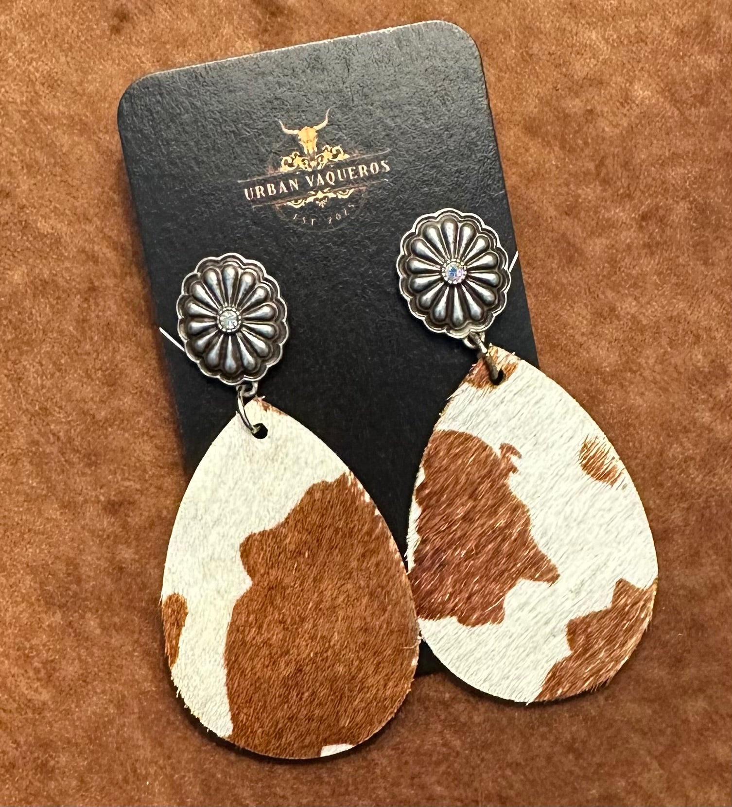 Add a bold, southwestern flair to your look with these handmade teardrop concho earrings, featuring a striking brown and white print. Lightweight yet full of personality, the carved concho design brings texture and visual interest, making them perfect for everyday wear or special occasions.