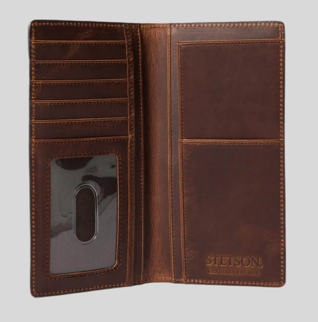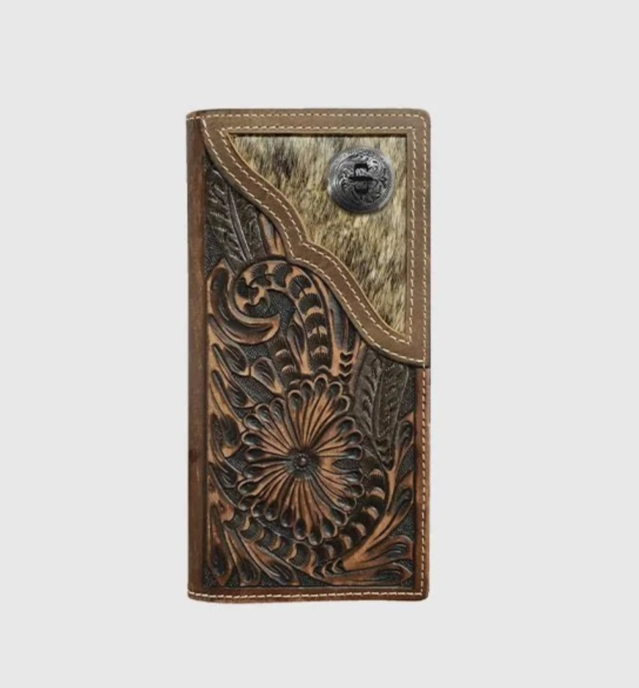 Top grain hand tooled leather and brindle hair on hide inlay with Stetson ® logo engraved concho in silver finish.