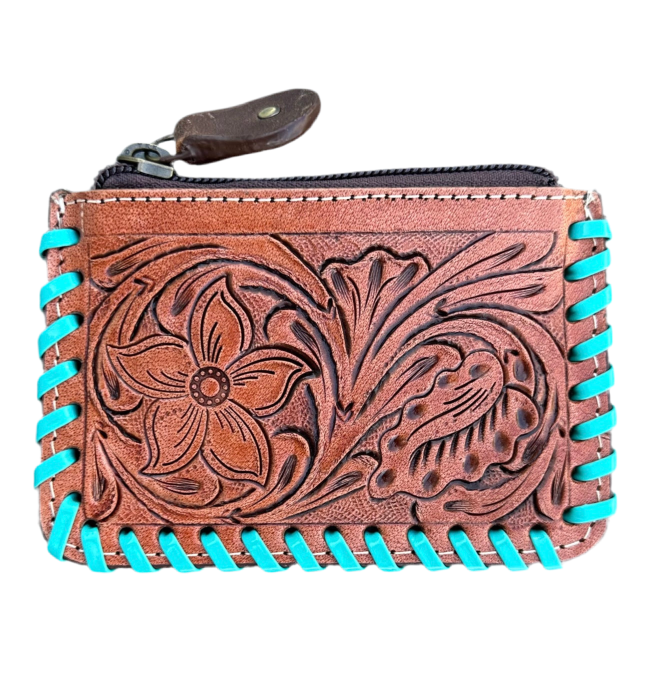 This 5" x 3" zippered coin wallet is stylish and practical. Features a beautiful floral tooled leather design on the front and back.