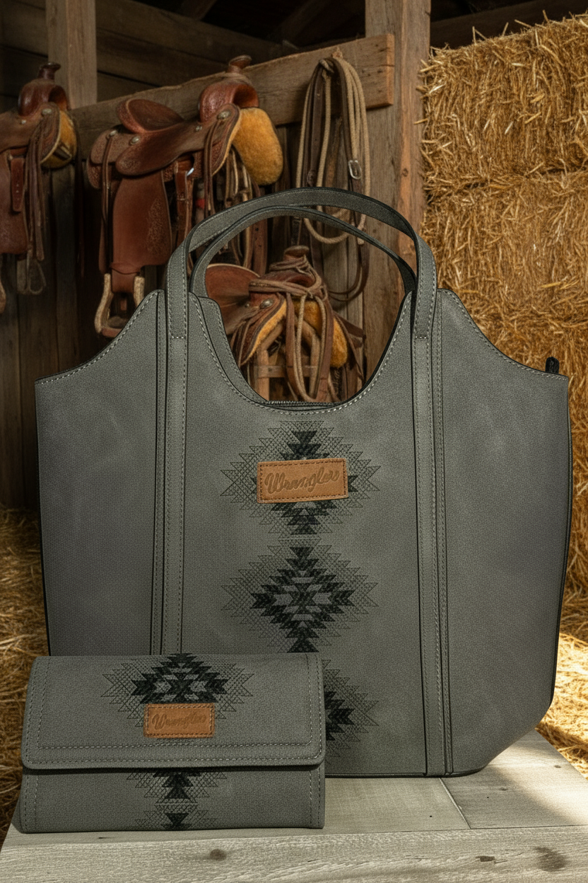 Wrangler Aztec Embroidered Tote Bag and Wallet-Black